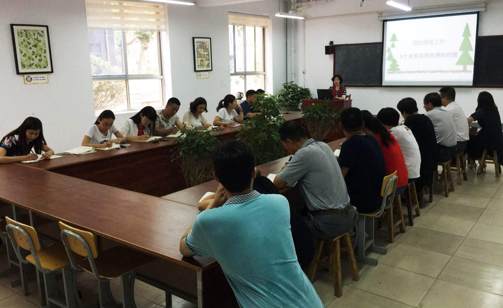 首先,在学校与社会的关系方面,梁院长谈到高校要始终把立德树人作为中心环节贯穿教育教学之中,坚守社会的良心,努力成为社会文化的引领者与建设者。其次,在教师与学生的关系上,主要从“师生关系怎么了?”、“师生关系是怎么样的?”、“我们做些什么?”几个问题对教师与学生的关系进行讲解。再次,思政课与专业课的关系上,总结得出,好的思政课一定要有专业水准,好的专业课也一定要有思政功底。然后,在课堂教学与社会实践的关系上,强调要重视和加强第二课堂建设,为学生更好地成长成才搭建广阔的锻炼舞台。最后,在继承传统与改革创新的关系方面,谈到要用好互联网这个先进工具,最大限度壮大网上正能量。