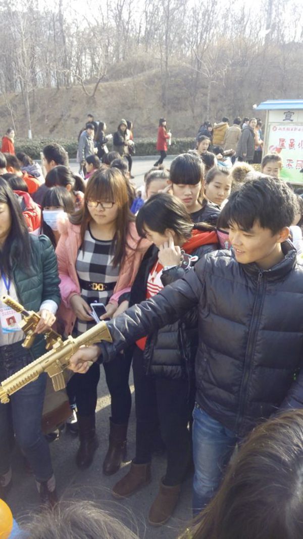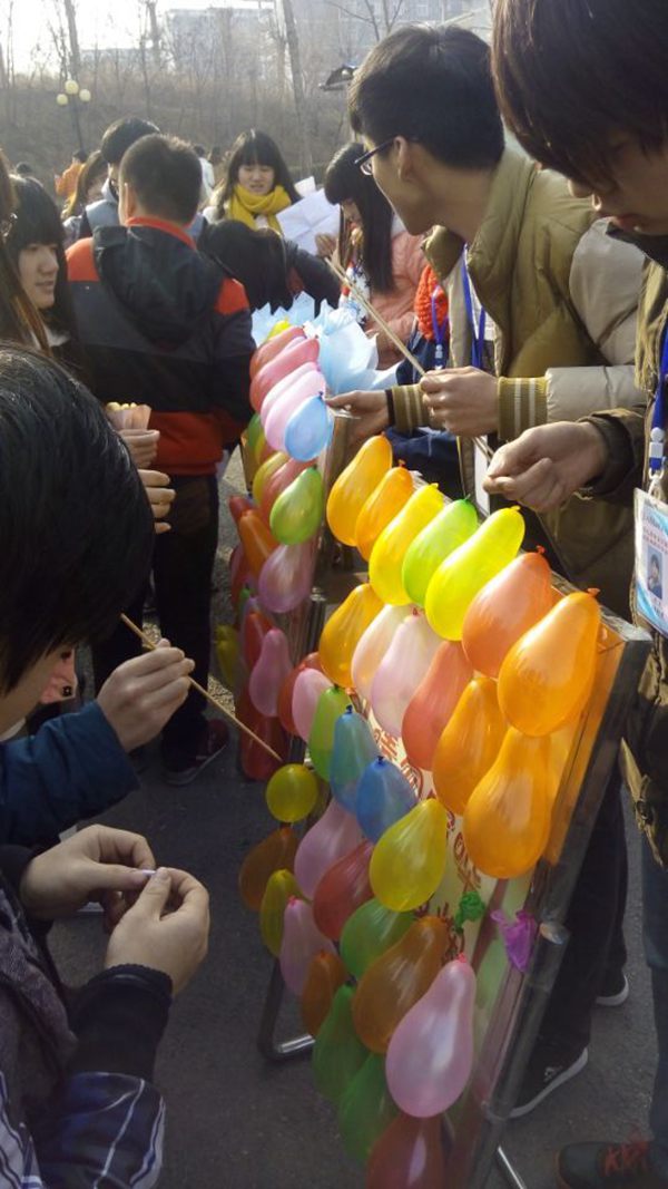 12月23日,“颐心居”学生公寓社区组织委员会在学院5号公寓门口举办了“约吗?约!”迎元旦趣味寻宝闯关活动。整个活动以“寻宝”主线贯穿,共设置A、B、C三关,依次进行。第一关是扎气球,气球里的纸条由“约”和“炸弹”两种字样,拿到“约”的同学进入下一关。第二关是公寓安全知识问答,答对者进入最后一关。第三关是玩具手枪打气球,同学们带着“约”字条和答题字条到本关打破气球,按照气球里纸条上字样分别领取玫瑰花、窗花、贴画、苹果和糖等奖品。