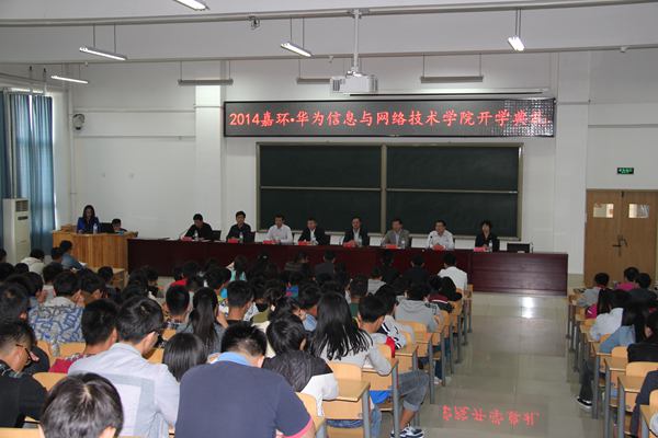 随后,在学院第六教学楼506合堂举行嘉环•华为信息网络技术学院2014级开学典礼。山东轻工职业学院院长孙志斌,副院长梁菊红,南京嘉环科技有限公司董事长、总裁宗琰,副总裁杨晨,总经理景象出席典礼。学院相关部门负责人,南京嘉环科技有限公司有关人员,嘉环•华为信息网络技术学院2014级全体学生参加活动。