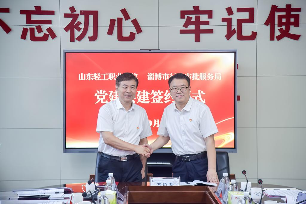 本站讯(通讯员 李飞 翟恒德)9月19日,学校与淄博市行政审批服务局联合举行党建共建签约仪式暨“系统联学”活动。双方理论学习中心组成员参加活动。