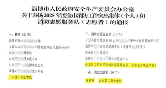 同期,淄博市消防救援支队发布表彰通报,我校获“淄博市消防工作先进集体”“十佳消防志愿服务队”两项市级荣誉,嘉环ICT产业学院教师张新奇被评为淄博市“优秀消防志愿者”。