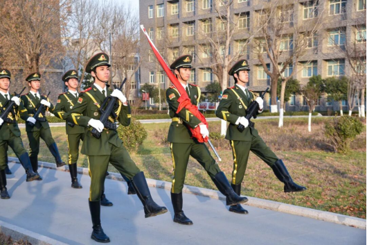 上午8时,升国旗仪式正式开始。国旗仪仗队迈着铿锵有力的步伐,护卫国旗入场。全体师生肃立注目,迎国旗、升国旗、奏唱国歌,五星红旗在冬日的晨光中冉冉升起,迎风飘扬。